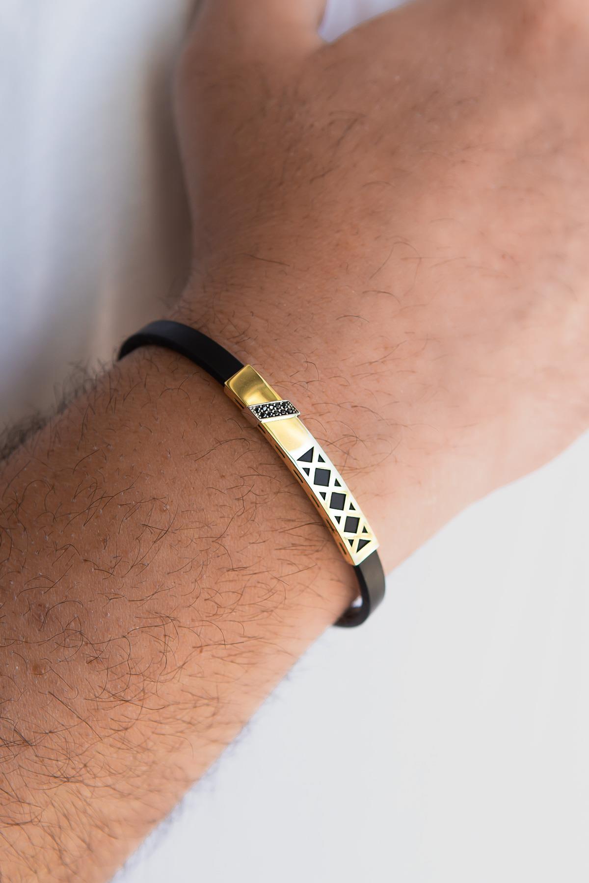 Semiz Kuyumculuk Siyah Taşlı Kauçuk Erkek Altın Bileklik